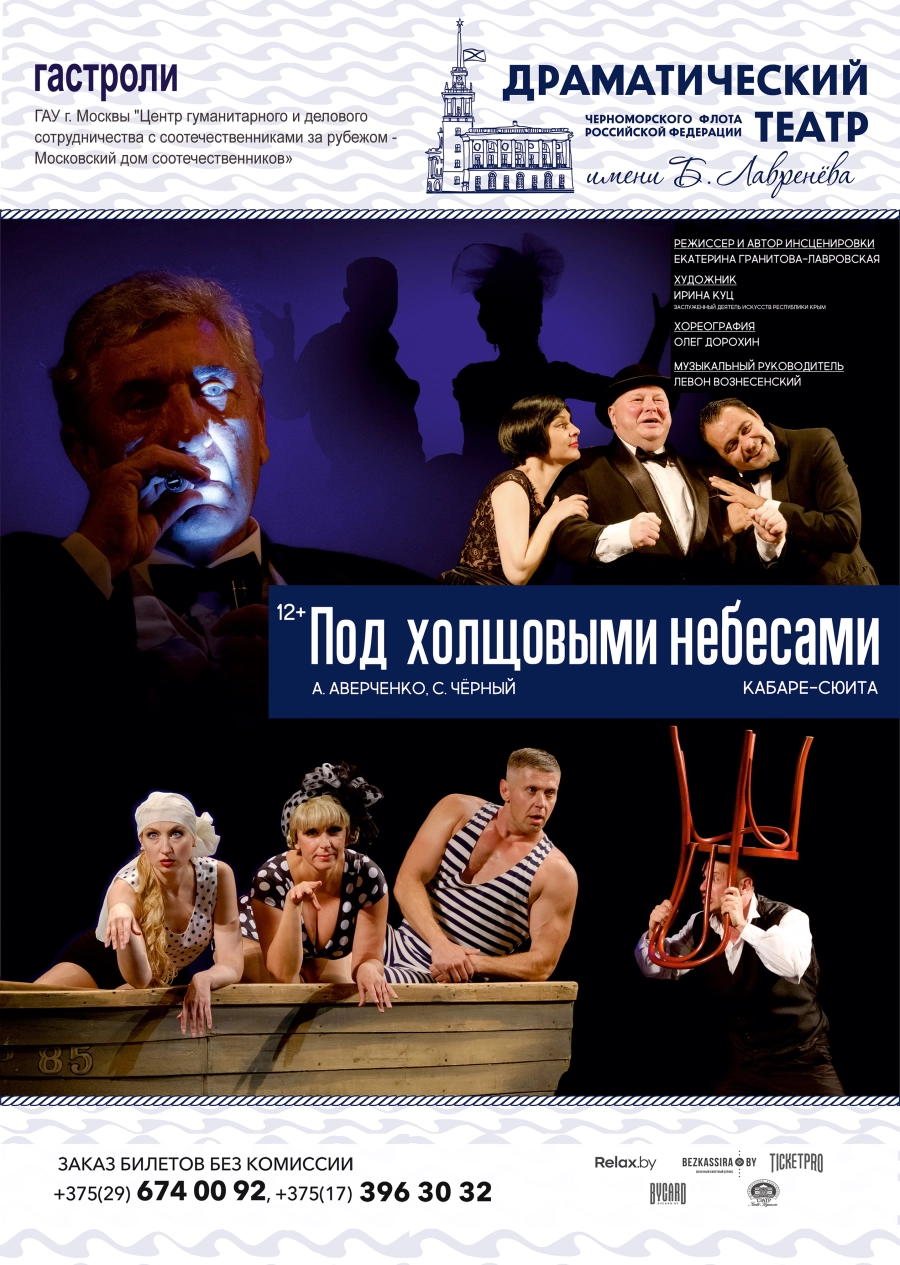 Кабаре-сюита «Под холщовыми небесами» - спектакль с севастопольским характером. Экзотическая смесь психологических особенностей русского человека часто приводит к комическим ситуациям, в которые попадают герои рассказов Аркадия Аверченко. Есть что-то в произведениях «короля смеха» очень близкое нам, ведь Аркадий Тимофеевич родился в Севастополе в далеком 1880 году. Аверченко был основателем и редактором знаменитого журнала «Сатирикон», в которым сотрудничал и поэт Саша Черный. Для спектакля «Под холщовыми небесами» мы собрали несколько забавных историй из книжек этих веселых людей и превратили их в кабаре-сюиту. Автор сценария и режиссер-постановщик спектакля – Екатерина Гранитова-Лавровская. Спектакль стал призером фестиваля военных театров «Звездная маска» и Фестиваля фестивалей «У Золотых ворот». Но, главное, он пользуется неизменным успехом у севастопольских зрителей.