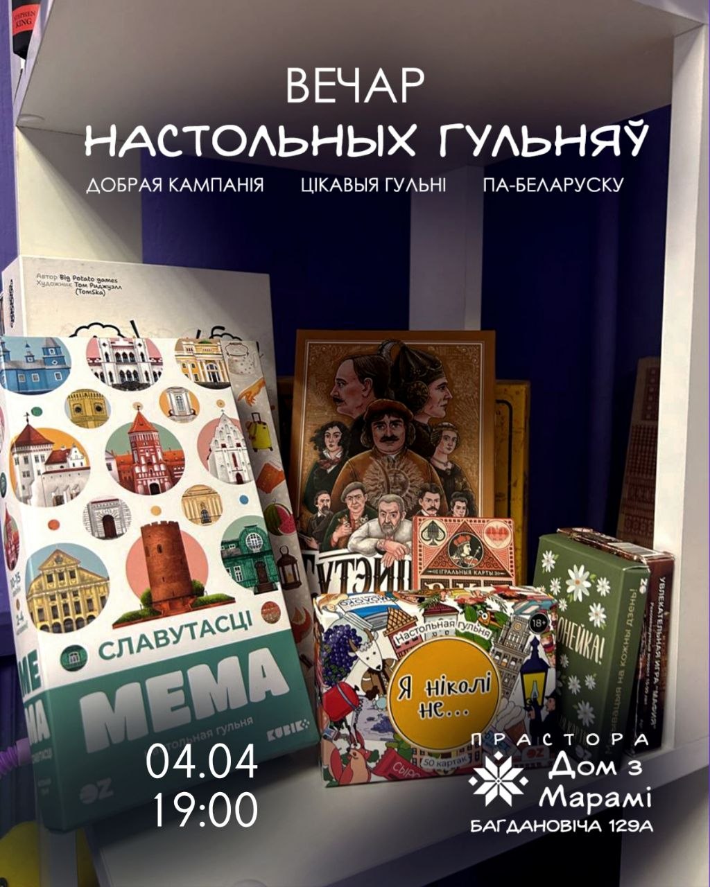 Праводзім вечар утульна і весела за настольнымі гульнямі па-беларуску (Манчкін, Бункер, Бэнг і г.д.).