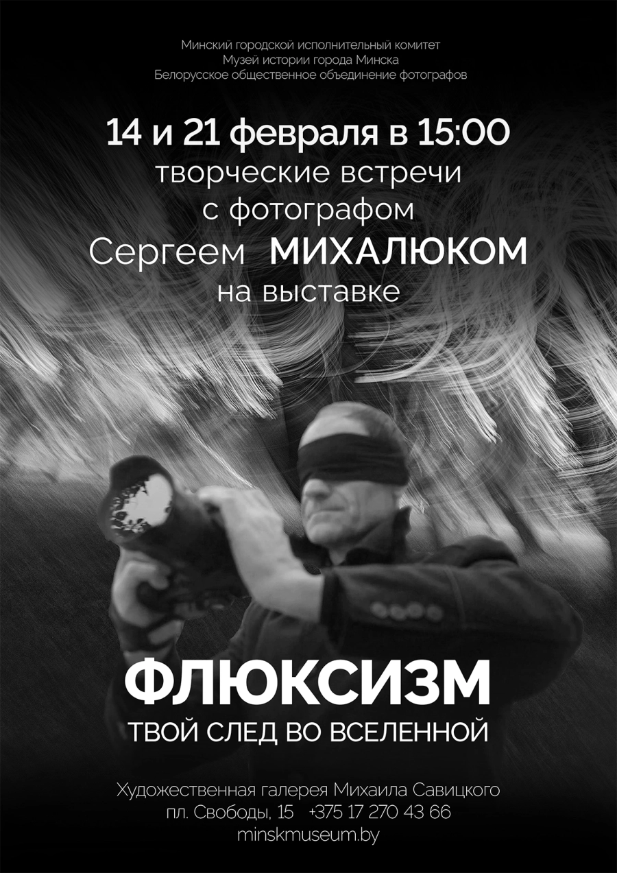 В рамках выставки концептуальной фотографии «Флюксизм. Твой след во Вселенной» в Художественной галерее Михаила Савицкого состоятся творческие встречи с автором выставки Сергеем Михалюком. Флюксизм (от англ. flux — поток) — инновационное направление, основанное белорусским фотографом и хореографом Сергеем Михалюком, где камера с длинной выдержкой фиксирует не объекты, а световые потоки, рожденные движением. Вход на мероприятие по билету на выставку.