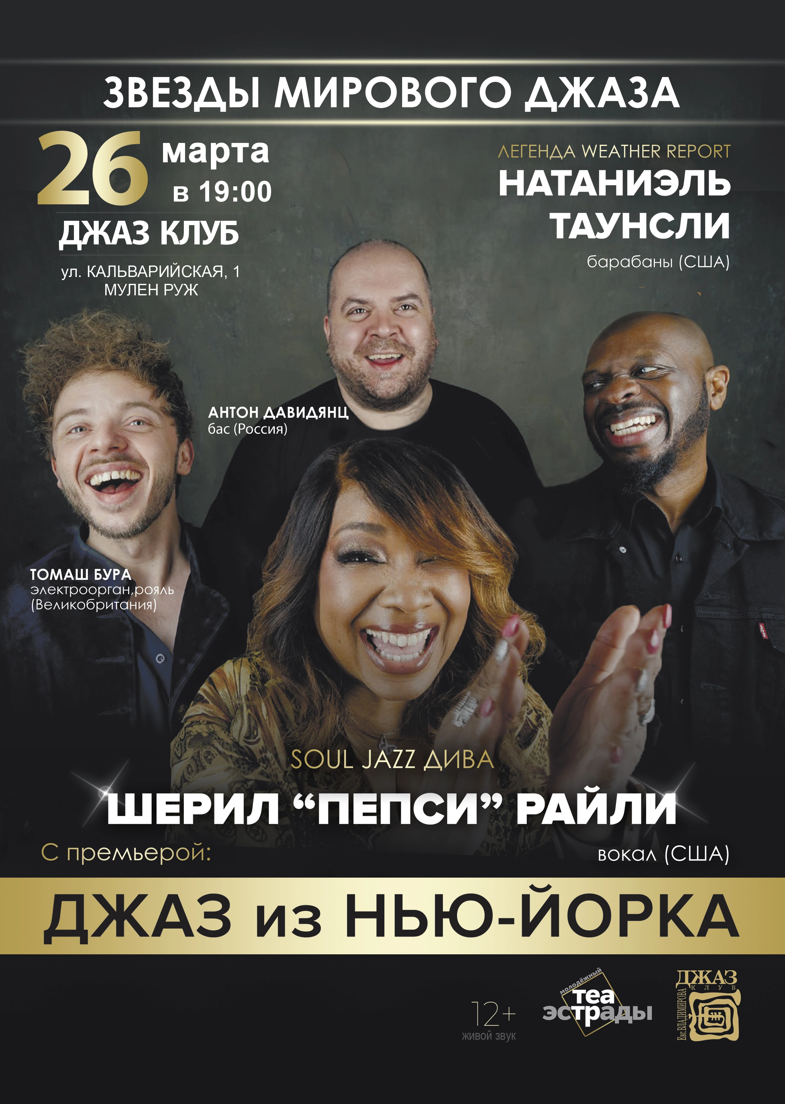 ПОП-ДЖАЗ ДИВА ШЕРИЛ «ПЕПСИ» РАЙЛИ (Нью-Йорк) И ЛЕГЕНДАРНЫЙ БАРАБАНЩИК НАТАНИЭЛЬ ТАУНСЛИ (Нью-Йорк) с премьерой концерта «ДЖАЗ ИЗ НЬЮ-ЙОРКА» (12+). Впервые в Минске! Уникальный шанс услышать суперзвёзд мировой джазовой музыки на одной сцене! Концерт американской pop-jazz дивы ШЕРИЛ «ПЕПСИ» РАЙЛИ (Нью-Йорк) и легендарного барабанщика Weather Report НАТАНИЭЛЯ ТАУНСЛИ (Нью-Йорк) в сопровождении звёзд мировой джазовой сцены — группы Interplay: Томаш Бура (рояль, орган, синтезаторы, Великобритания), Антон Давидянц (фендер джаз-бас) с премьерой «ДЖАЗ из НЬЮ-ЙОРКА»! Прозвучат ультрамодные шедевры в стиле фьюжн, джаза, соула и рока, вдохновленные культурным наследием самой музыкальной столицы планеты — Нью-Йорка!