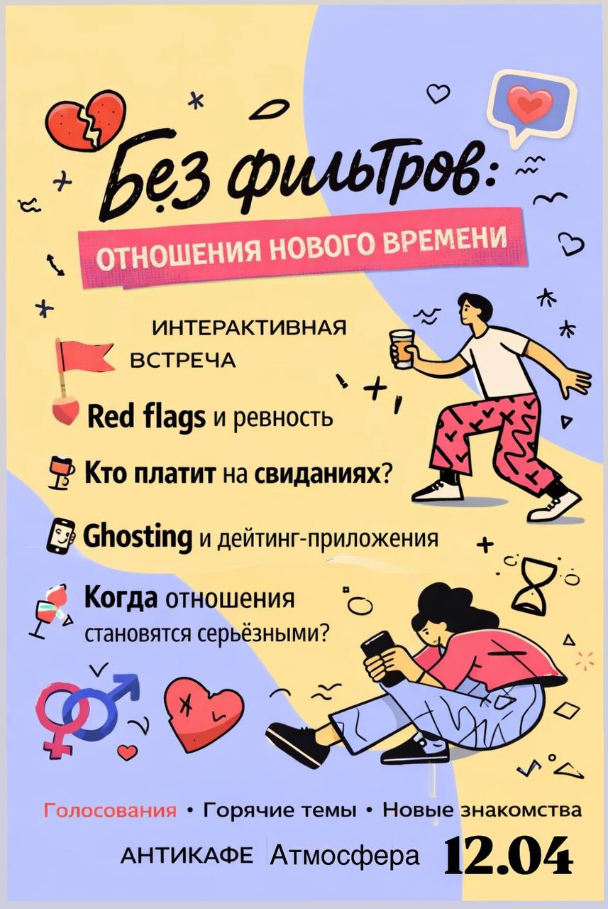 Обсудим честно: — кто платит на свиданиях — ghosting и дейтинг — ревность и границы — когда отношения становятся серьёзными — красные флаги Интерактивный формат: голосования, реальные ситуации и живое общение. Без лекций — только честный разговор и новые знакомства. Стоимость 35₽